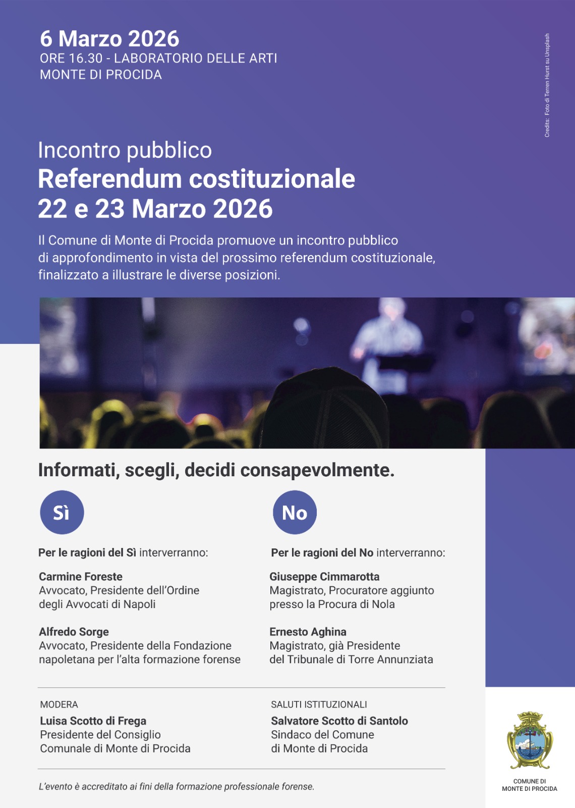 Il Comune di Monte di Procida promuove un incontro pubblico di approfondimento in vista del prossimo Referendum costituzionale, finalizzato a illustrare le diverse posizioni.